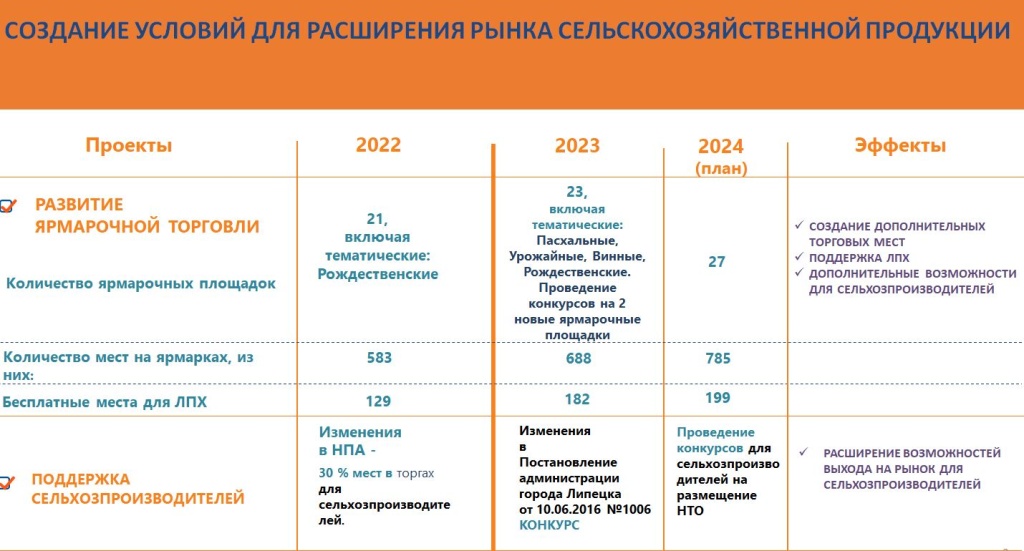 - Если на 2019 и 2020 год поступления в бюджет от ярмарок составляли 0 рублей, то в прошлом году – 3 миллиона 526 тысяч рублей. Количество торговых мест за это время также увеличилось. Появились бесплатные места для владельцев личных подсобных хозяйств, которые устанавливаются и обслуживаются за счет бизнеса, - отметила Ася Франценюк . – На конец 2023 года бесплатных мест для ЛПХ было 182, в этом году мы запланировали увеличение до 199 мест. Также до конца 2024 года планируем 27 ярмарочных площадок.