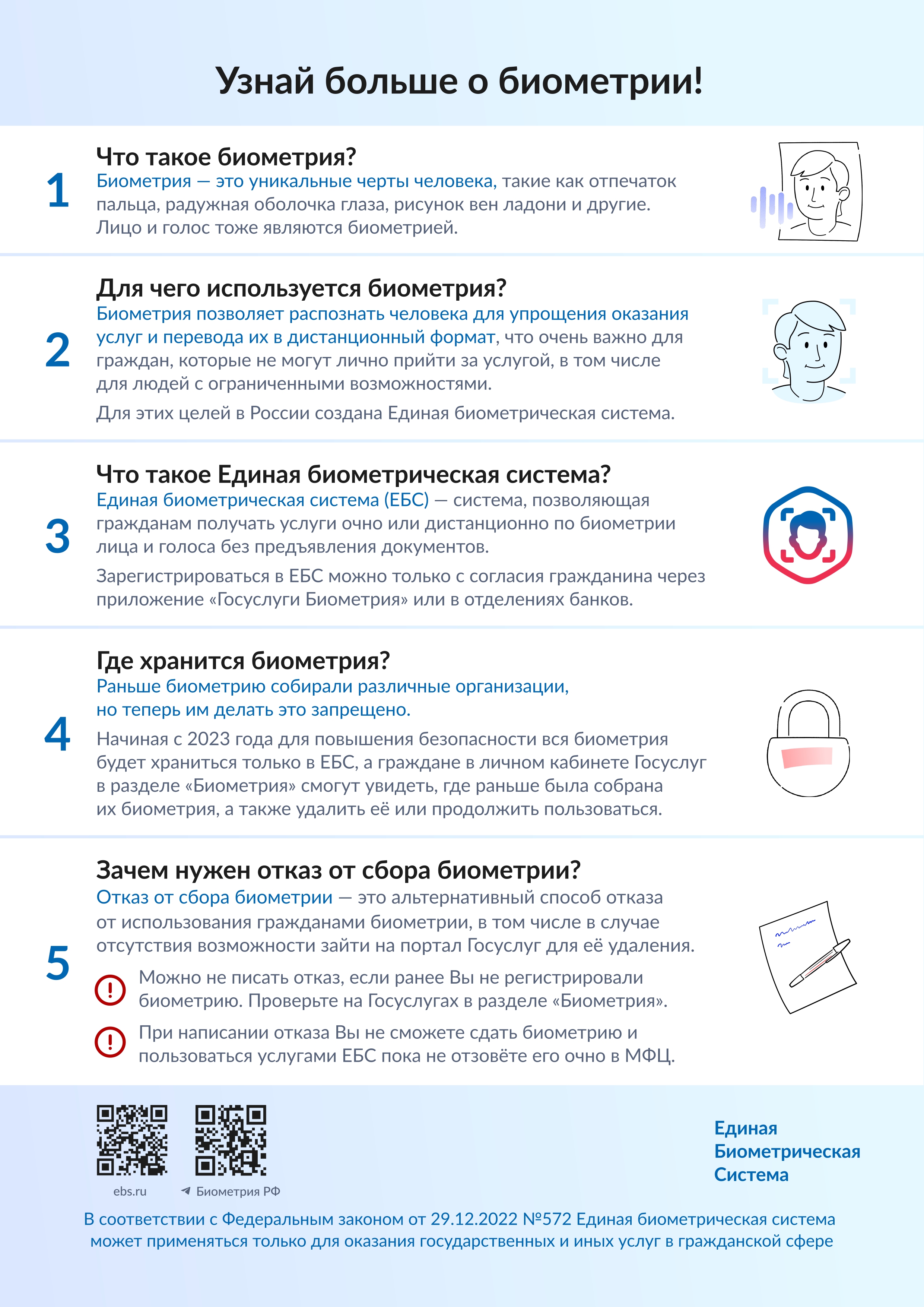 По закону сбор, хранение и обработка биометрических персональных данных осуществляется с помощью Единой биометрической системы. Каждый человек может отказаться от обработки данных либо, наоборот, позволить использовать их для подтверждения личности.