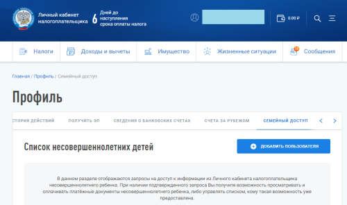 В личном кабинете физического лица реализована функция «Семейный доступ», которая позволяет родителям оплатить налоговые начисления за несовершеннолетних детей.