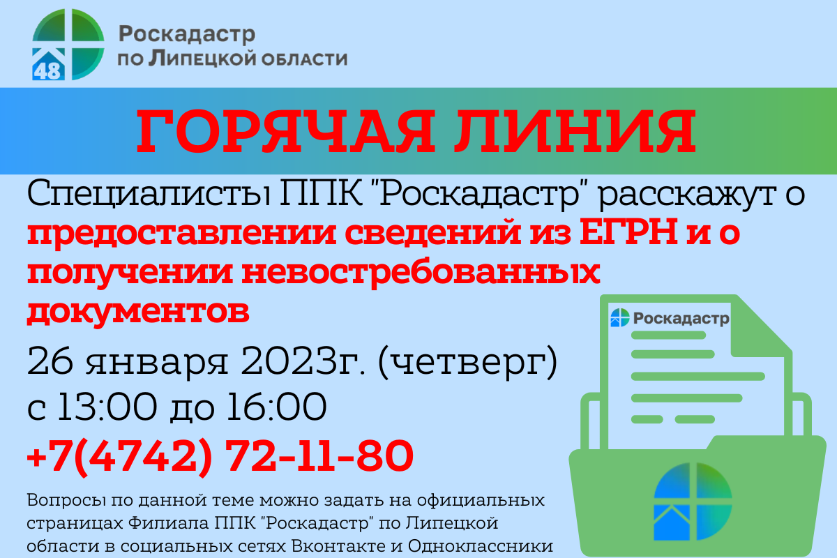 получение невостребованных документов из архива Роскадастра; получение копий правоустанавливающих документов; получение документов из государственного фонда данных, полученных в результате проведения землеустройства; предоставление сведений из единого государственного реестра недвижимости.Звонки будут приниматься 26 января 2023 года с 13:00 до 16:00 по телефону: 8 (4742) 72-11-80 .