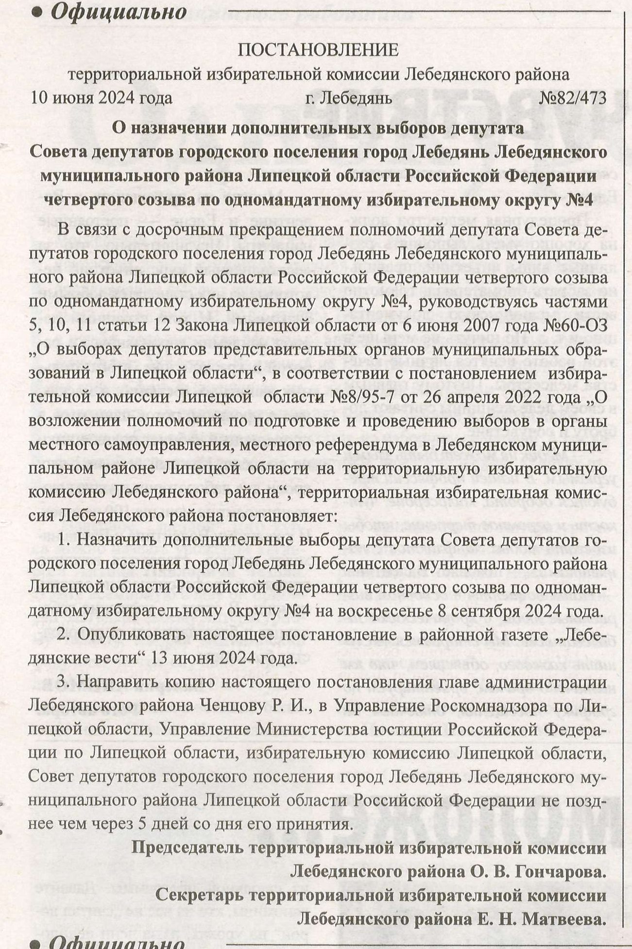 Постановление территориальной избирательной комиссии назначении дополнительных выборов депутата Совета депутатов городского поселения город Лебедянь Лебедянского муниципального района Липецкой области Российской Федерации четвертого созыва по одномандатному избирательному округу №4 сегодня опубликовано в районной газете "Лебедянские вести". С завтрашнего дня начинается период выдвижения кандидатов избирательными объединениями, самовыдвижением. Он продлится по 13 июля этого года.