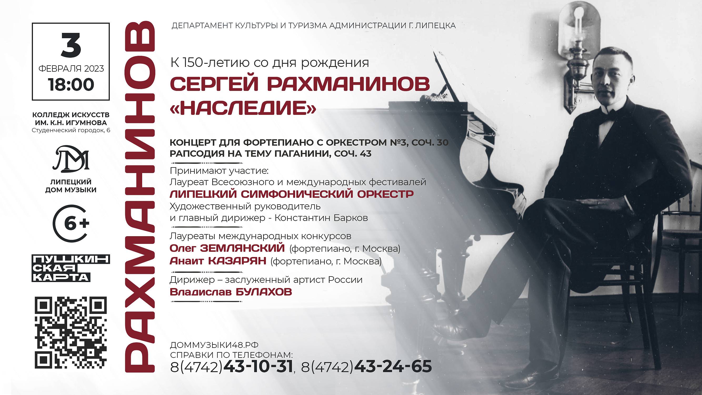 Концерт состоится в областном колледже искусств им. К.Н. Игумнова ( г. Липецк, Студенческий городок, 6). Прозвучат: Концерт для фортепиано с оркестром №3, соч. 30, Рапсодия на тему Паганини, соч. 43.
