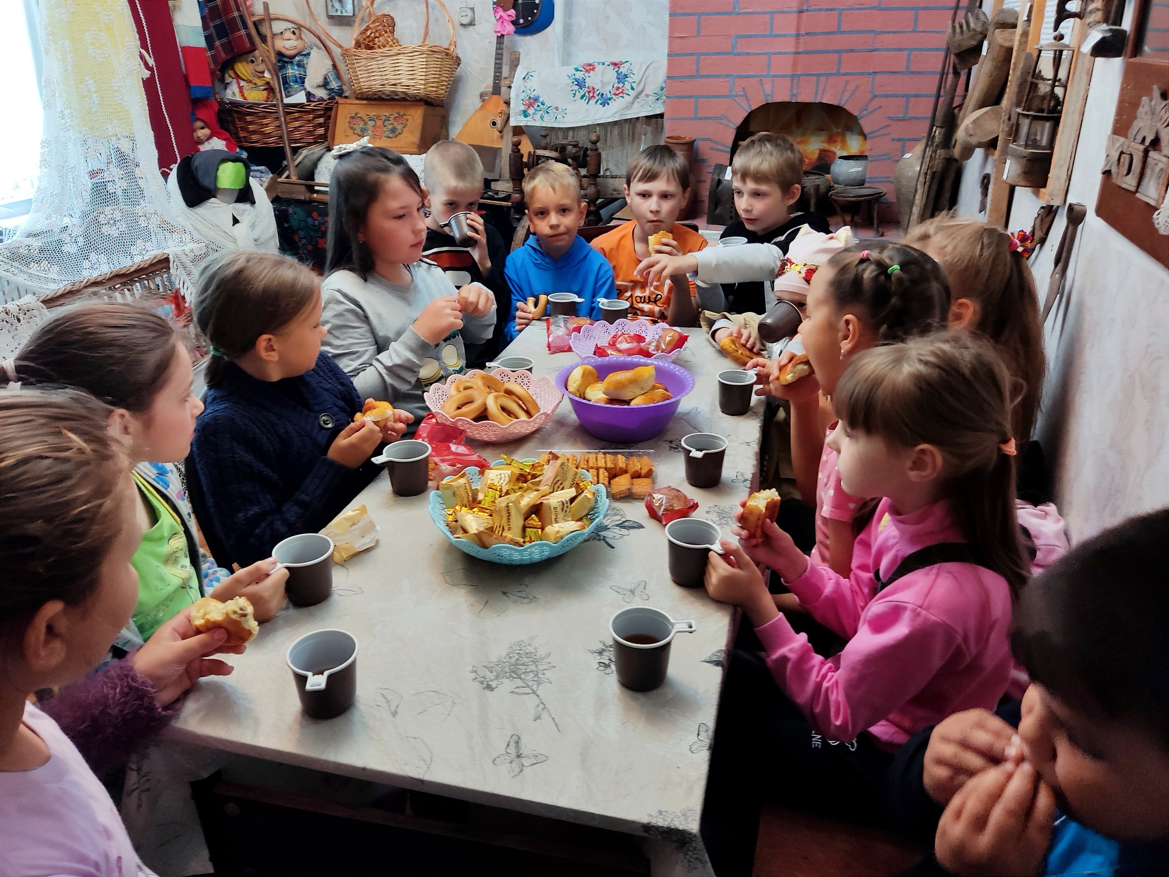 Дети узнали, что представляла из себя русская изба, в которой главную роль играла печь. Печь кормила, обогревала и даже лечила. Каково было их удивление, когда они узнали, что в печке мылись и даже совершали обряд «перепекания» младенца. Юные читатели узнали, что такое «Красный угол» и почему его так называют. Выяснили чем отличались лавка и скамья. Познакомились с многочисленной домашней утварью. Узнали, что еду готовили в чугунках, доставая их из печи с помощью ухвата, за водой ходили с коромыслом. Очень тяжел был у наших предков быт, но и отдыхать они умели весело и задорно. Осенними и зимними вечерами люди собирались в большой избе, устраивали посиделки, на которых проводили время за любимым занятием: пряли пряжу, вязали одежду, плели лапти, корзины, вышивали полотенца и скатерти. А затем, откладывали свои дела и начинали веселиться: пели, плясали, рассказывали сказки, прибаутки и небылицы. Мероприятие сопровождалось различными конкурсами - отгадывали загадки, вспоминали пословицы и поговорки, пели частушки, читали небылицы, говорили скороговорки.