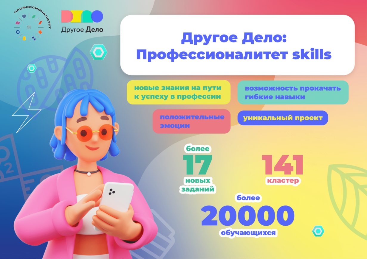 «Другое Дело: профессионалитет skills» — это уникальный проект, где можно получить разнообразный интересный опыт и новые эмоции, прокачать гибкие навыки, собрав личный набор инструментов на пути к успеху в профессии.