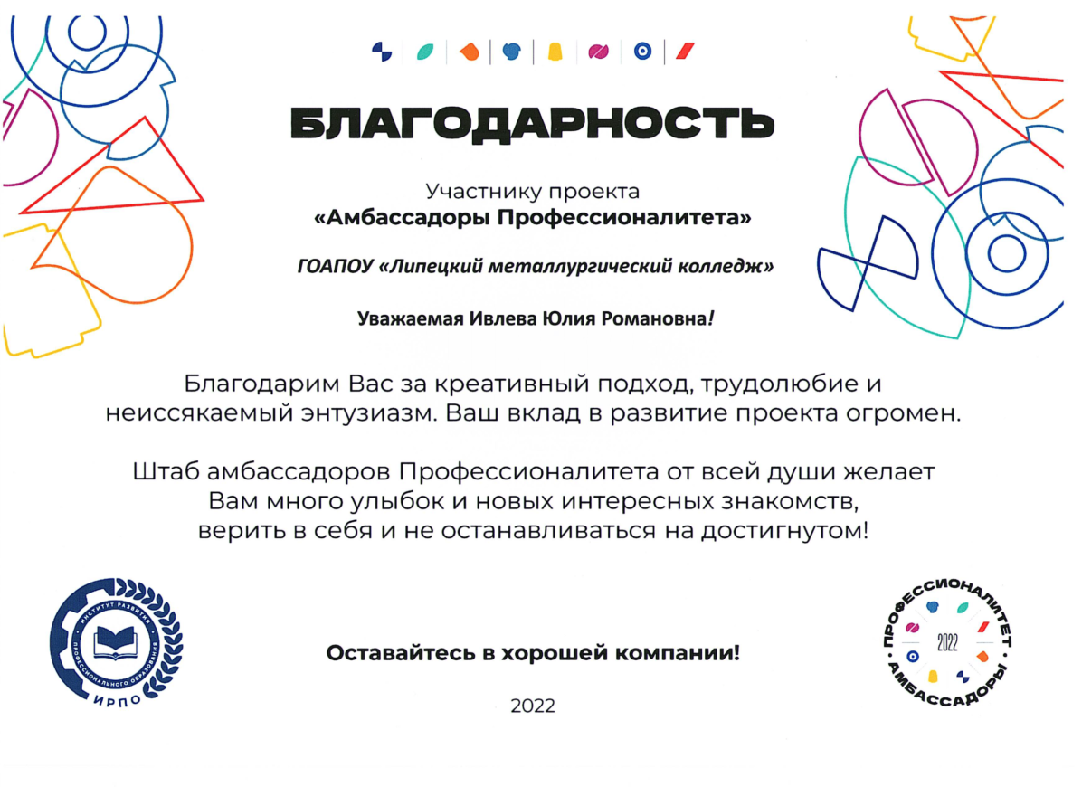 Студенты колледжа Ивлева Юлия, Козырев Данила, Мильгунова Мария, Овчинникова Анастасия, Пастухов Артем и куратор-наставник команды проекта Кирюхина Е.И. были награждены Благодарностями Штаба амбассадоров Профессионалитета.