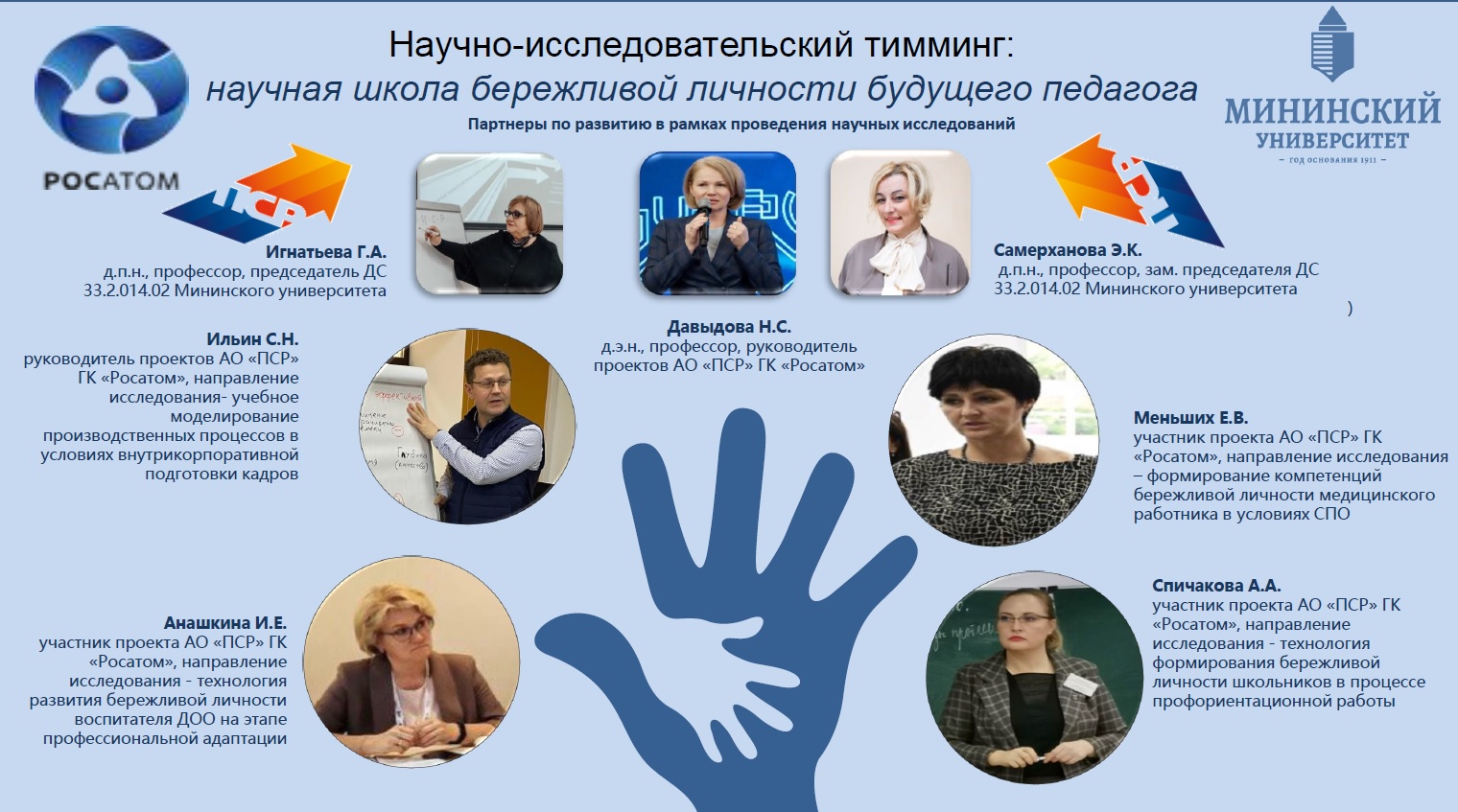 В рамках научно-исследовательского тимминга была очерчена организационно – методическая рамка технологии индивидуально-организационного сопровождения исследований, проводимых в контексте научной школы бережливой личности, которую ведет Давыдова Надежда Станисловавна, доктор экономических наук, профессор, руководитель проектов АО «ПСР» ГК «Росатом».