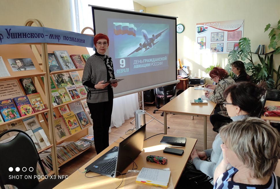 Главный библиограф В.Л. Городнина выступила с консультацией «Страна Аэрофлот», посвященная 100-летию российской гражданской авиации. Она представила историческую справку о российской авиации, книги из раздела фонда 39.5 «Воздушный транспорт», статьи об истории и сегодняшнем дне международного аэропорта «Липецк». Вера Львовна познакомила библиотекарей с обзором художественной литературы о летчиках и авиации; отобразила авиацию в искусстве (фильмы, песни об авиации и летчиках); предложила формы и названия мероприятий для использования в работе. Библиотечные специалисты поучаствовали в тест-викторине «Там, за облаками».