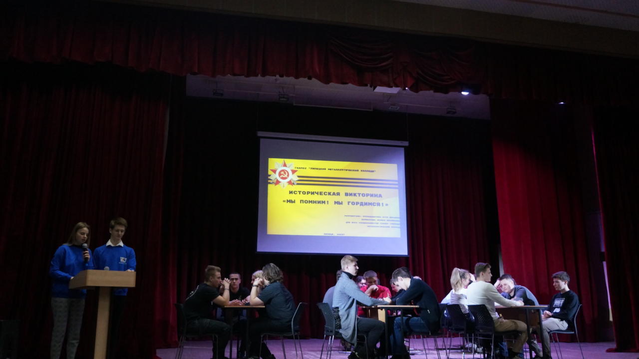 3 мая 2023 г. в актовом зале Липецкого металлургического колледжа прошла Викторина «Мы помним! Мы гордимся!» для студентов и их педагогов-наставников, посвященная 78-й годовщине Победы советского народа в Великой Отечественной войне 1941-1945 гг.