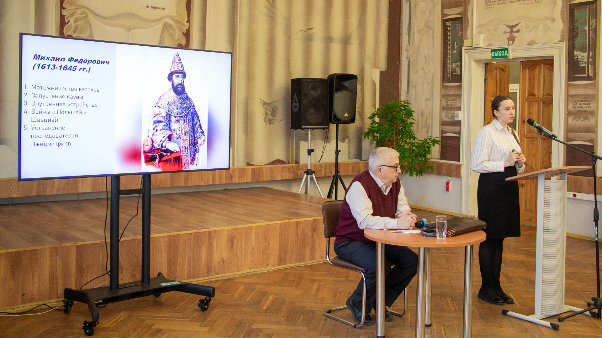 Первым докладом, представленным на заседании, стало обстоятельное выступление студентки Софьи Пашковской: «Филарет и Михаил Федорович Романовы», в котором было рассказано о событиях, предшествующих воцарению Михаила Романова.