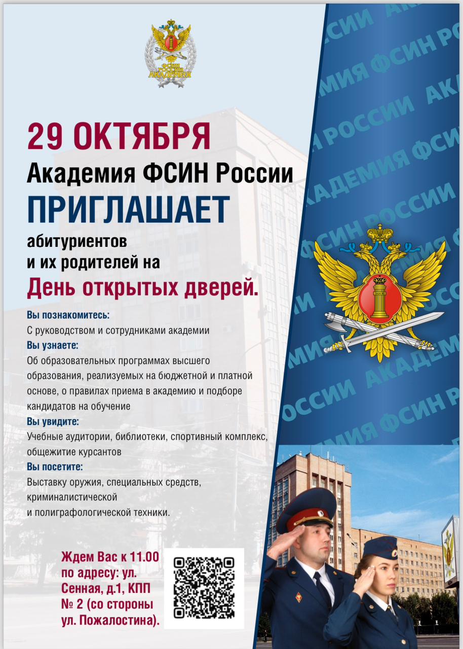 В воскресенье, 29 октября, Академия ФСИН России приглашает абитуриентов и их родителей на День открытых дверей. Ждем Вас к 11.00 по адресу: г. Рязань, ул. Сенная, д.1., КПП № 2 (со стороны ул. Пожалостина).