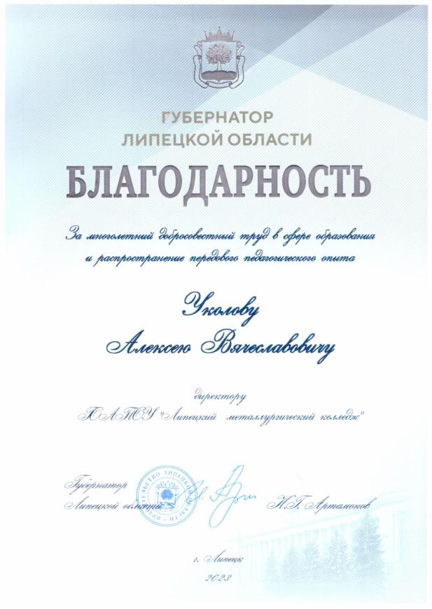 В рамках Форума состоялось торжественное награждение работников образования Благодарностью Губернатора Липецкой области «За высокий профессионализм, активную жизненную позицию, принципиальность и ответственность в вопросах защиты прав и интересов детей». Директор Липецкого металлургического колледжа А.В. Уколов также был удостоен Благодарности Губернатора Липецкой области.