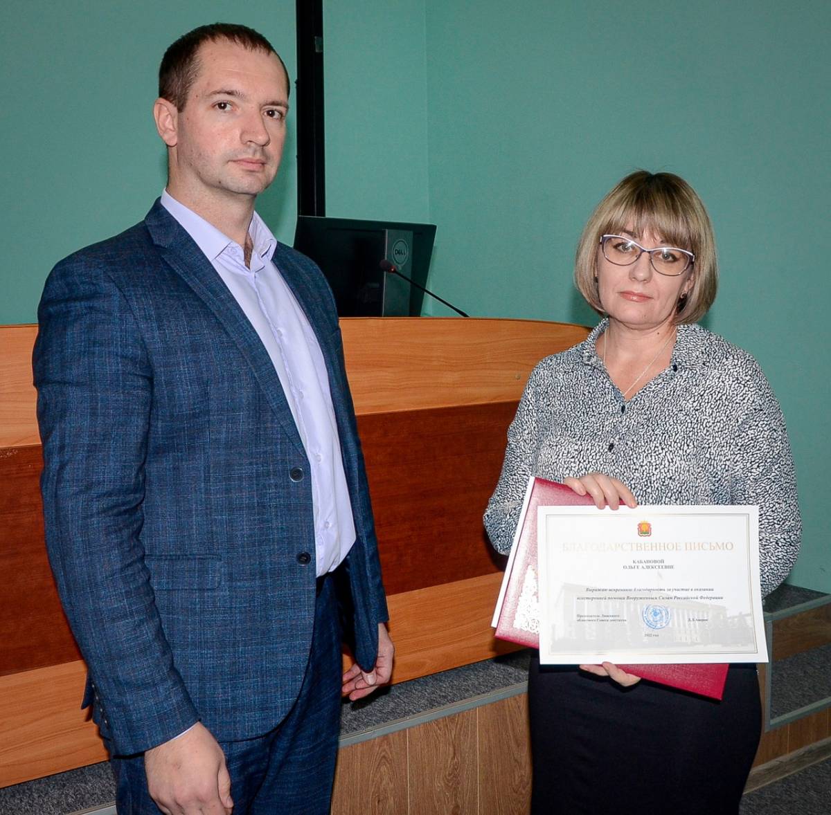 Благодарственным письмом от областного парламента за активную гражданскую позицию, оказание всесторонней помощи Вооруженным силам Российской Федерации, а также подарком наградили Ольгу Кабанову, Владимира Смольянинова и Алексея Атискова.