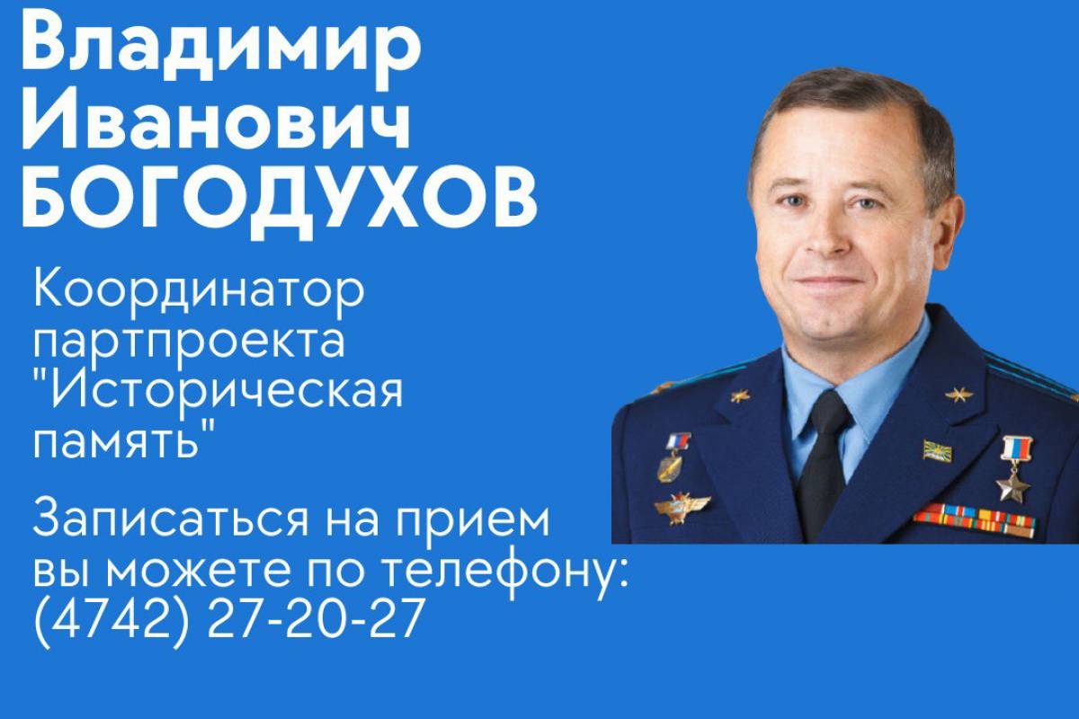 20 июля с жителями встретится Владимир Богодухов - координатор партийного проекта «Историческая память», руководитель Общественной приемной Д.А. Медведева в Липецкой области (11.00-13.00).