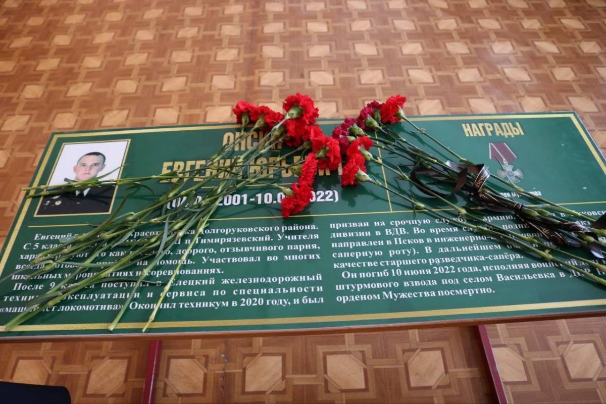 В филиале лицея поселка Тимирязевский состоялось торжественное открытие «Парты героя». Торжественное мероприятие, приуроченное к празднованию Дня защитника Отечества, было посвящено памяти выпускника этого образовательного учреждения Евгения Онсина.