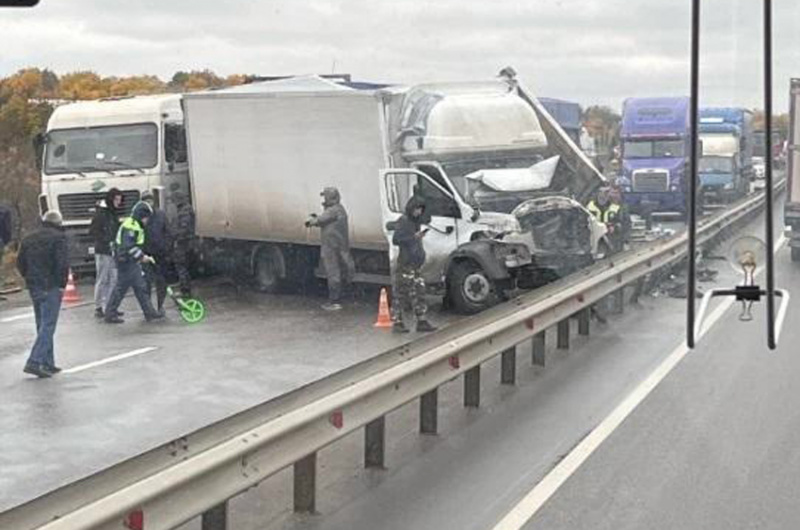 От удара фургон развернуло поперёк дороги. При этом передней частью машина уткнулась в разделяющее шоссе ограждения, а задней прижалась к другой фуре. Движение по трассе парализовано.