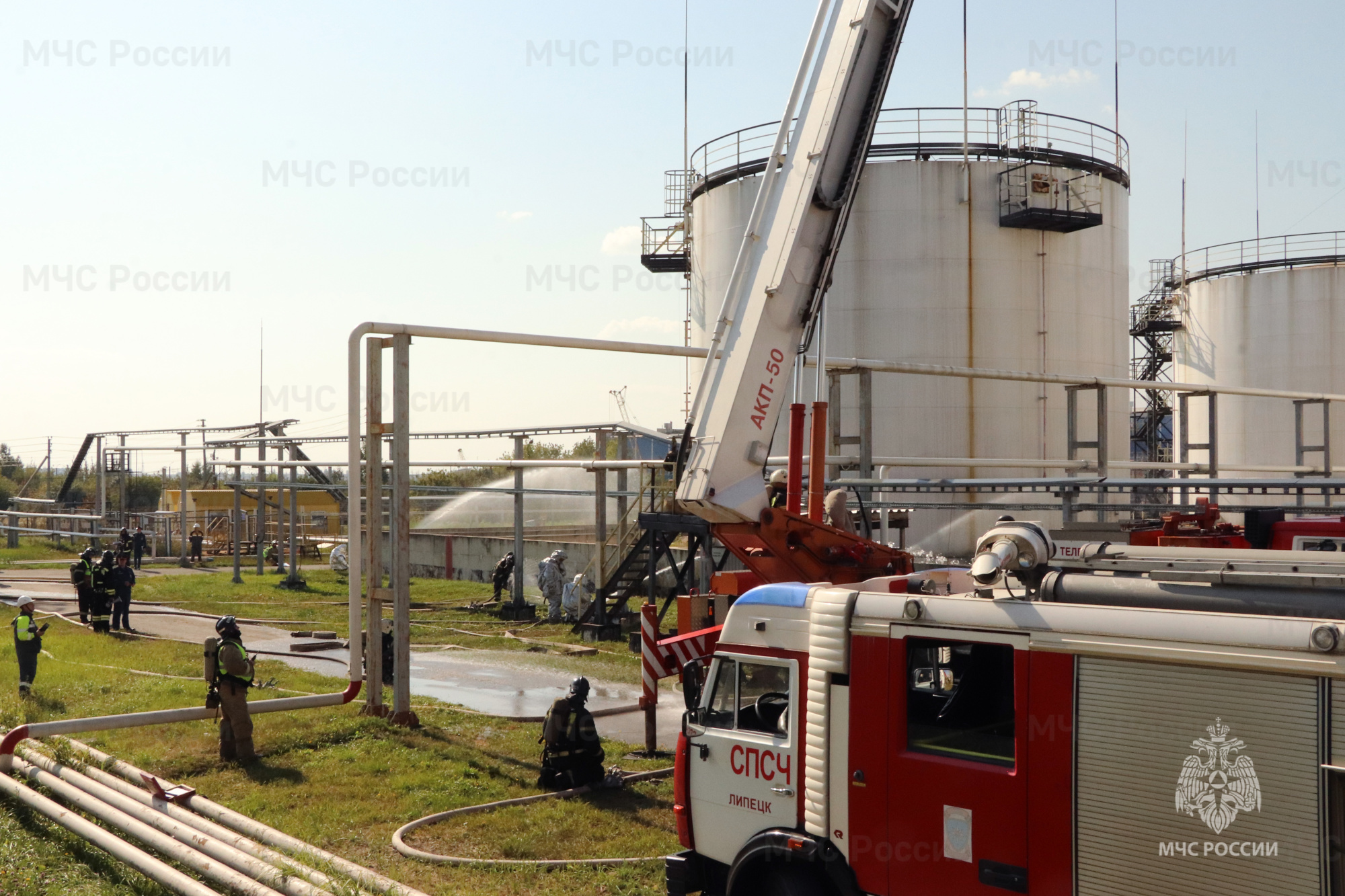 В Липецком районе спасатели МЧС отработали тушение условного пожара на нефтебазе.