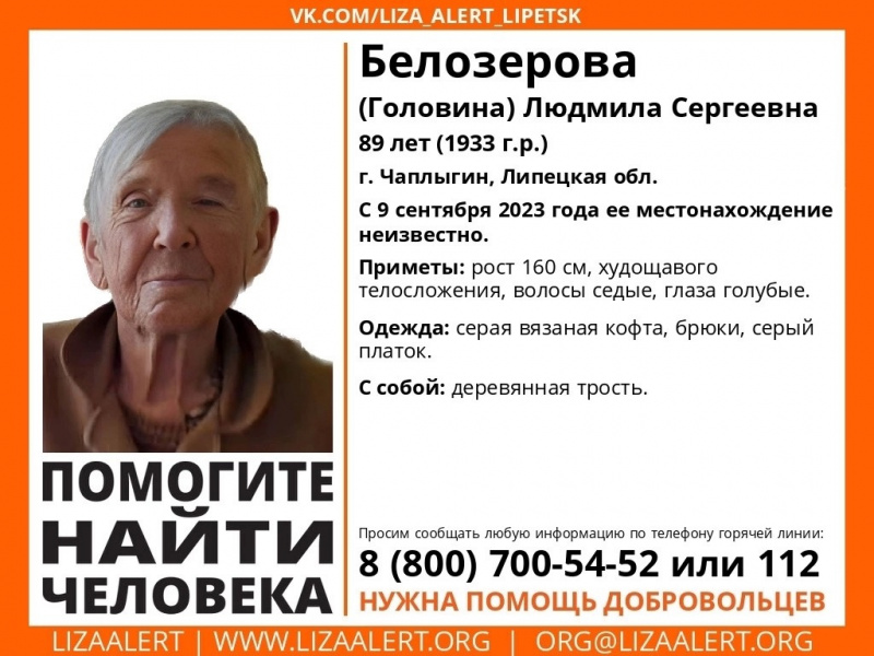 Старушка 1933 года рождения ушла из дома в Чаплыгине 9 сентября и до сих пор не вернулась.