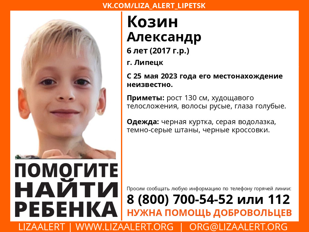 Фото поисково-спасательного отряда «Лиза Алерт»Пропавшего 6-летнего ребенка в черной куртке ищут в Липецке. Местонахождение Александра Козина неизвестно с четверга, 25 мая.