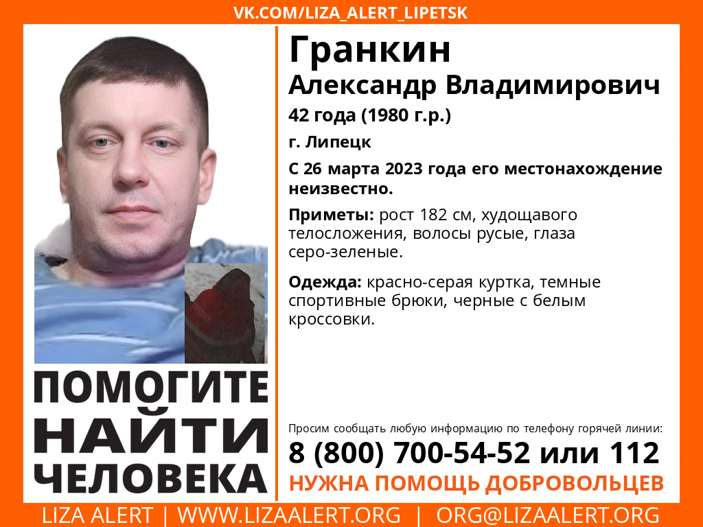Фото поисково-спасательного отряда «Лиза Алерт»42-летнего мужчину в красно-серой куртке уже неделю ищут в Липецке. Александр Гранкин перестал выходить на связь с 26 марта.