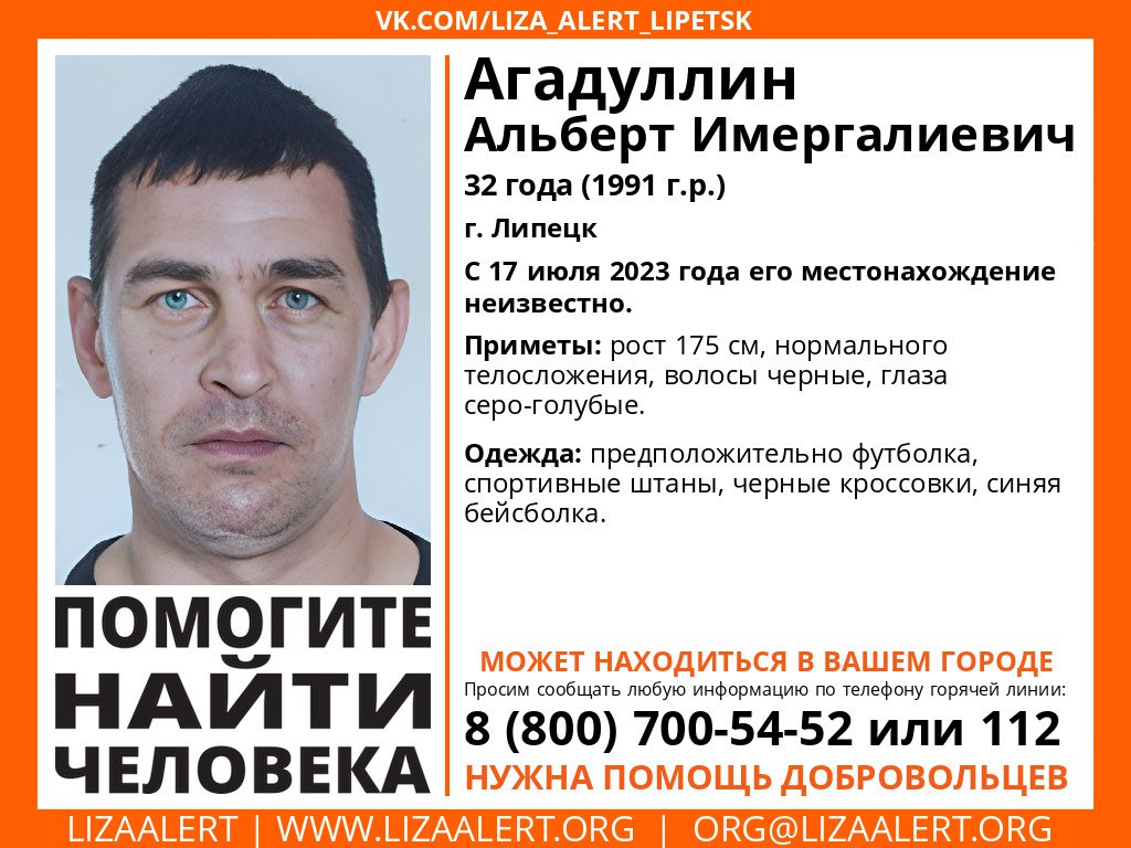 Фото поисково-спасательного отряда «Лиза Алерт».Уже неделю в Липецке ищут пропавшего 32-летнего мужчину с серо-голубыми глазами. Альберт Агадуллин перестал выходить на связь с 17 июля.