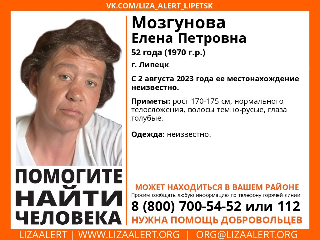 В Липецкой области ищут пропавшую 52-летнюю Елену Петровну Мозгунову. Женщина перестала выходить на связь с близкими 2 августа и с того момента о ее местонахождении ничего не известно.