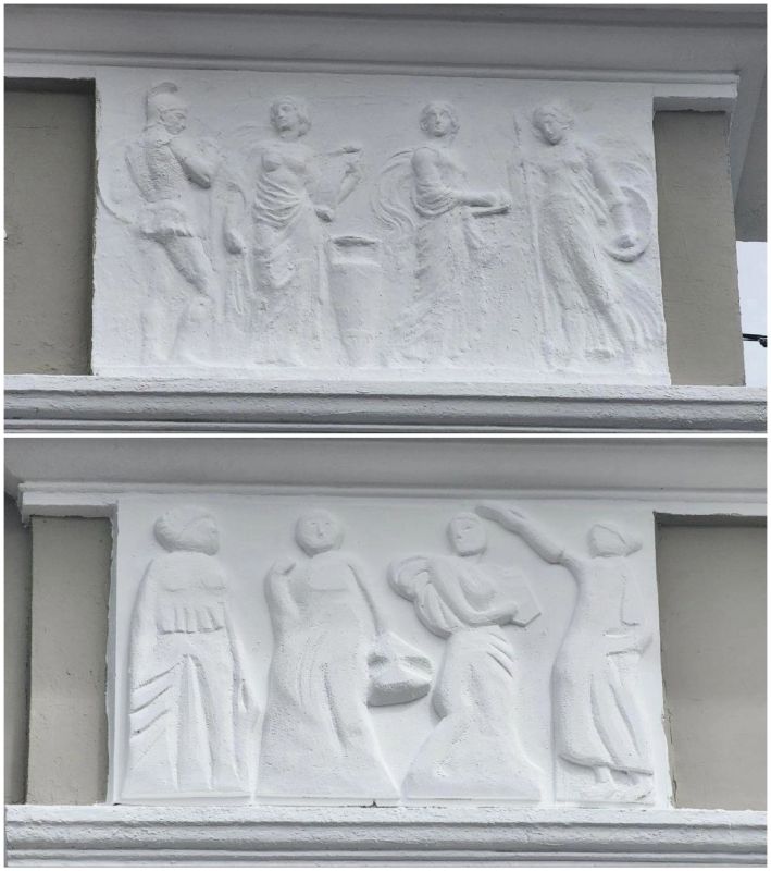 В Ельце реставрируют колледж искусств имени Тихона Хренникова. Когда дело дошло до барельефов на фасаде, липчане обратили внимание на то, что один из них сильно отличается от остальных. Фото, как выглядят барельефы опубликовали в паблике "Мой Елец. Новости".