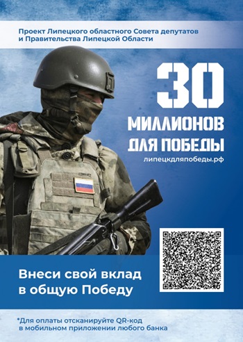 Липецким областным Советом депутатов при поддержки регионального правительства дан старт патриотической акции «30 миллионов для Победы», в ходе которой любое юридическое и физическое лицо может внести свой вклад и пожертвовать деньги для нужд специальной военной операции