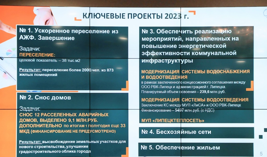 По словам председателя департамента ЖКХ мэрии Липецка Ирины Вербецкой , ускоренными темпами осуществляется реализация адресной программы переселения из жилфонда, признанного аварийным до 1 января 2017 года. В нее было включено 122 дома. Также в рамках программы «Развитие ЖКХ города Липецка» в 2022 году осуществлялась разработка проектно-сметной документации (ПСД) по ремонту газовых сетей, отремонтированы 5 квартир для повторного заселения. Ведомство обследовало 14 МКД на пригодность для проживания. Разработаны проекты по сносу 7 расселенных аварийных домов, 6 - было снесено.
