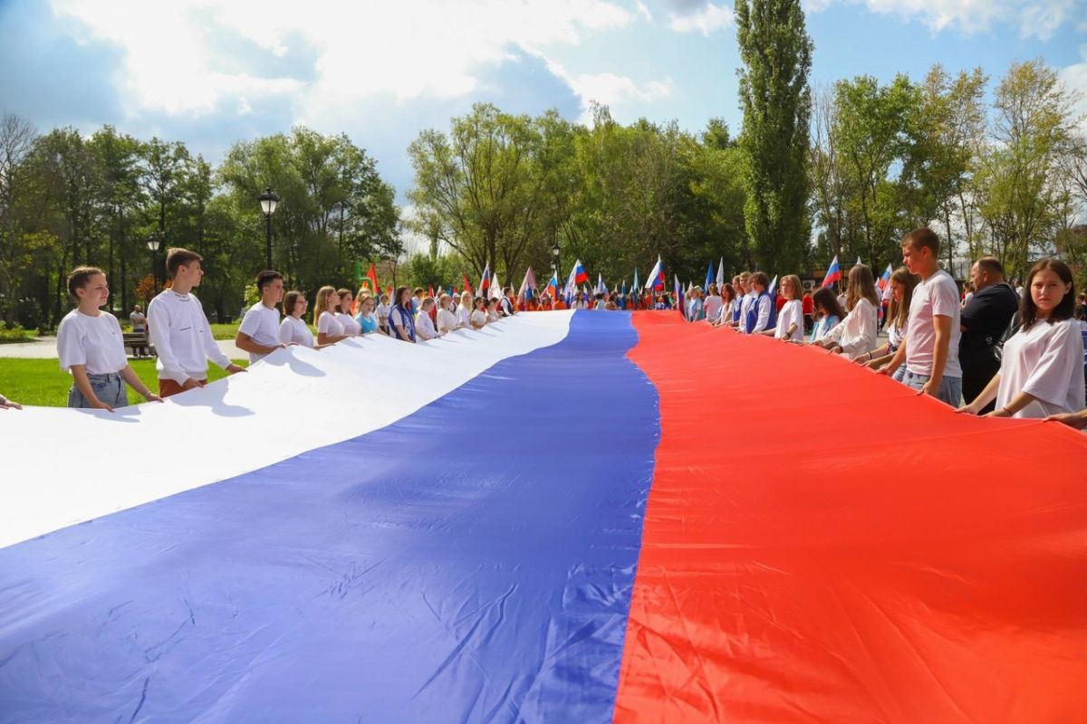 В Липецке День Государственного флага России отметили церемонией выноса огромного триколора. Его вынесли на площадь Ленина — Соборную и прошагали с ним по Петровскому спуску до Нижнего парка, где состоялся праздничный концерт.