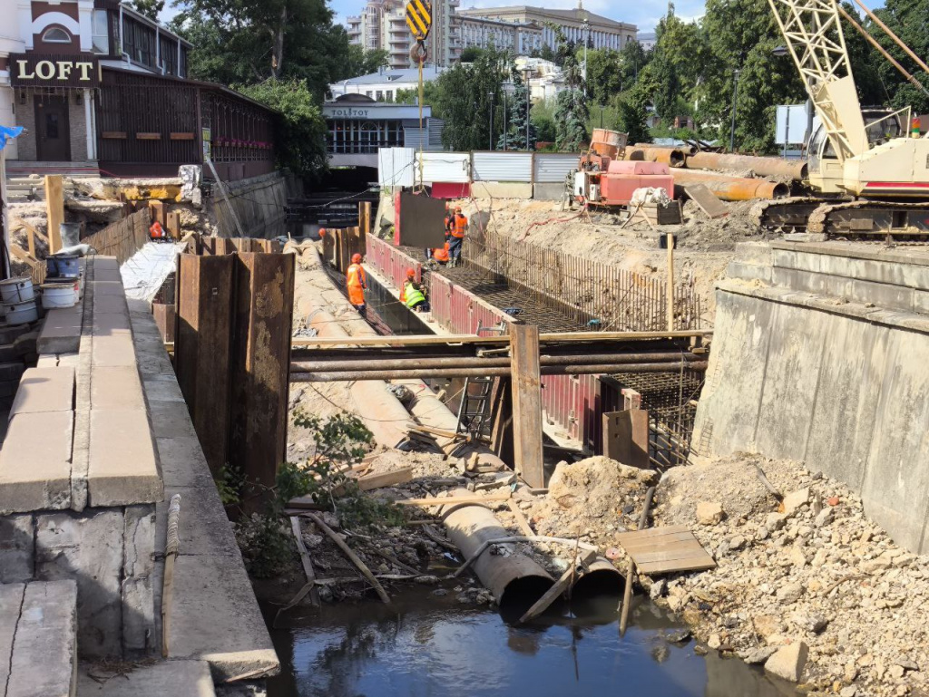 По словам представителя подрядной организации, работы идут круглые сутки. Днем на объекте задействованы 18 рабочих, две бригады монтажников, ночью — одна числом девять человек. Высокие темпы очевидны по значительному уменьшению кучи грунта, вынутого из места проведения работ по сравнению с той, которая была тут 13 июня, в предыдущий визит сюда СМИ. Скоро с площади Революции полностью вывезут всю землю, песок и остатки бутовых стен, на которых держался старый мост. И держался еле-еле, что и подтвердило обрушение его тротуарной части в марте, сразу же после того, как подрядчик стал забивать в основание нового моста первые сваи.
