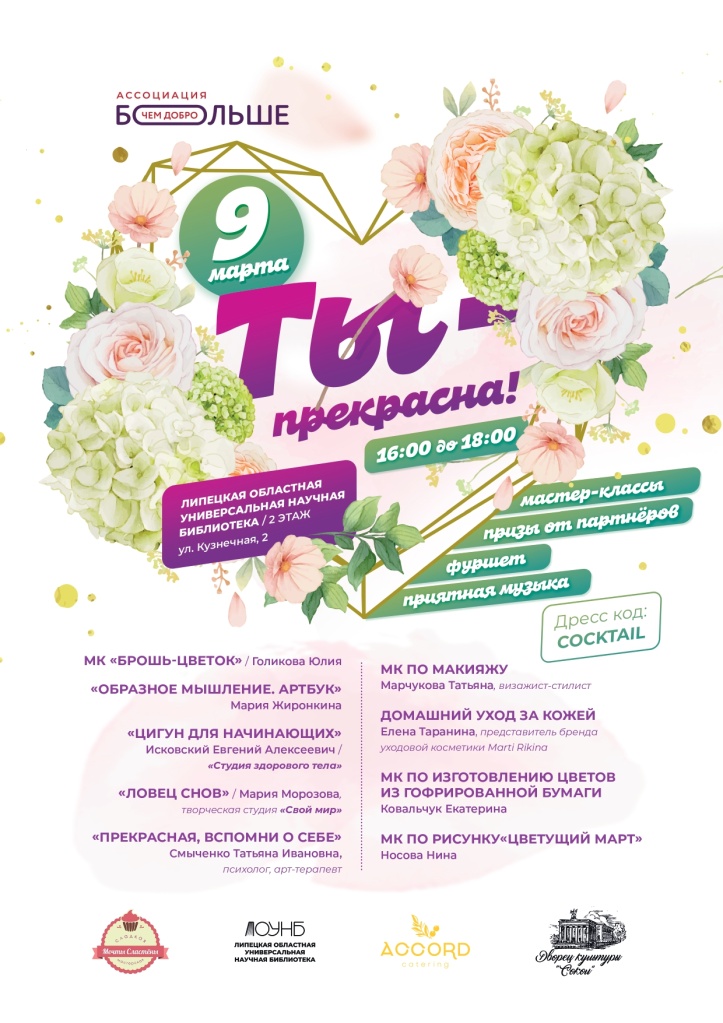 Ставший уже традиционным праздник «Ты прекрасна!» для женщин, входящих в состав организаций ассоциации «Больше чем добро!», состоится 9 марта в областной научной библиотеке Липецка