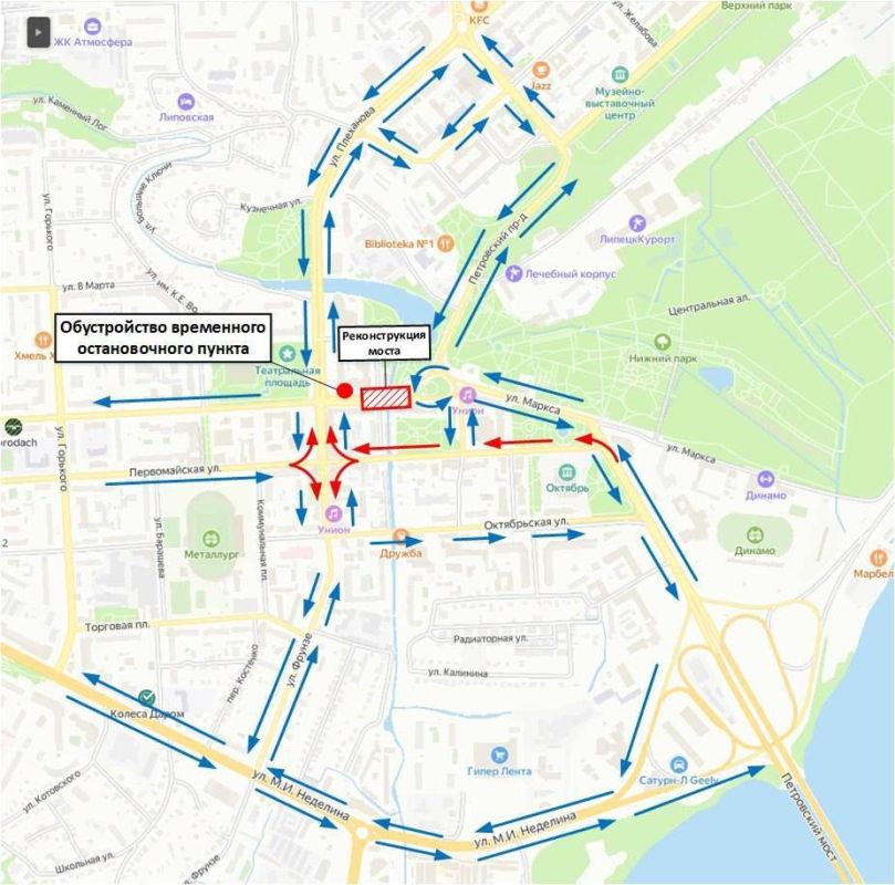 Маршруты №6, 27, 30, 308к, 330 при движении от НЛМК будут передвигаться по Первомайской и Фрунзе до Театральной площади, где будут поворачивать на Советскую.