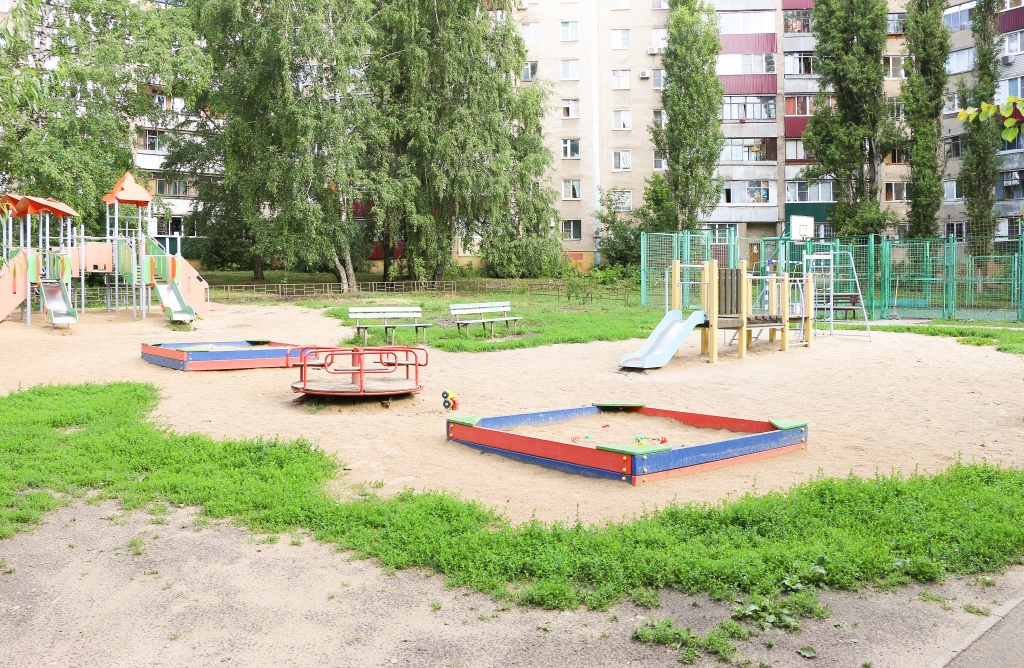 Здесь есть спортивная зона с прорезиненным покрытием, пространства для игр детей дошкольного и школьного возраста, беседка и даже небольшой фруктовый сад, за которым трепетно ухаживают жители. А территория пользуется популярностью не только у местных – рядом располагается детская стоматология, и родители часто заходят сюда вместе с детьми.