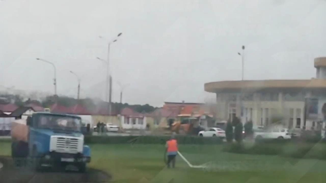 В Липецке дворники убирают лужи лопатой, а в дождь поливают траву.