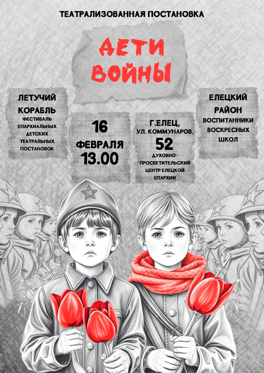 В рамках Фестиваля епархиальных детских театральных постановок «Летучий корабль» 16 февраля в 13.00 в Духовно-просветительском центре Елецкой Епархии состоится театрализованная постановка «Дети войны»,