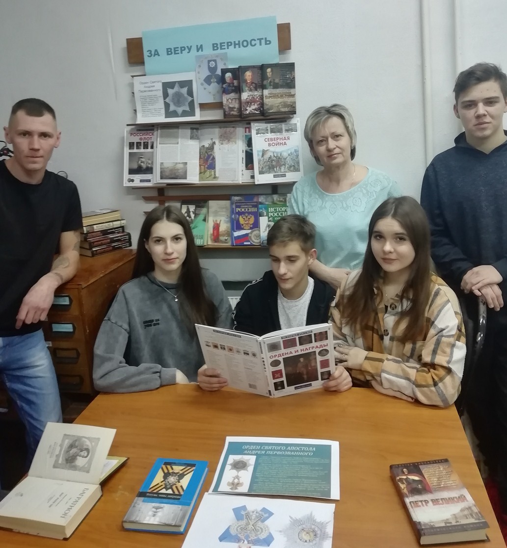 Рассказала о главных идеях награды: девиз – «За веру и верность» обозначает за веру в Бога и верность Государю, символ – Святой Апостол Андрей Первозванный, как покровитель России, принесший учение Божие на наши земли. Орден вручался тем, кто отличился исключительными заслугами, которые способствовали процветанию России. О том, что с 1 июля 1998 года, указом президента Б. Ельцина орден был снова восстановлен в качестве высшей государственной награды Российской Федерации. На книжной выставке «За веру и верность» можно было познакомиться с книгами по истории России и художественными произведениями об исторических личностях - кавалерах Ордена. На часе истории прозвучали имена кавалеров Ордена - ими стали: академик Дмитрий Лихачев, конструктор оружия Михаил Калашников, патриарх Алексий II, писатель Александр Солженицын и Сергей Михалков, поэт Расул Гамзатов и др. Библиотекарь обратила особое внимание ребят на личность кавалера Ордена Св. Андрея Первозванного Петра Петровича Семенова Тянь-Шанского, являющегося нашим земляком, географическая деятельность, которого принесла открытия мировой величины. Итогом встречи были слова о том, что нужно беречь и уважать то наследие, те победы, которые нам достались от наших блистательных полководцев, восхищаться талантом писателей и открытиями ученых, гордиться государственными и общественными деятелями, которые достойно представляли страну. Гордиться теми людьми, которые нас защищали и защищают, научиться уважать и чтить свою Родину, знать ее историю.