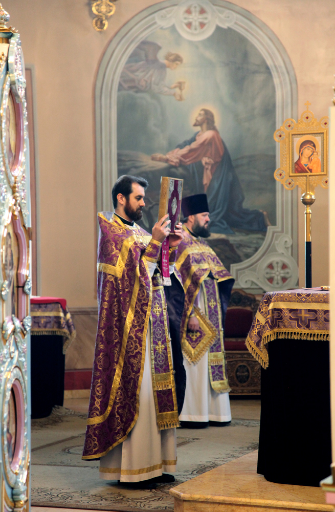 Его Высокопреосвященству сослужили протоиереи: Василий Бильчук, настоятель собора, Владимир Максимчук, ключарь собора, Алексий Носач; иереи: Сергий Гришанов (вечер), Виктор Архипкин, Александр Алешин; диакон Андрей Кантарюк, клирики собора.