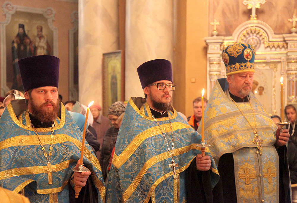 Его Высокопреосвященству сослужили протоиереи: Василий Бильчук, настоятель собора, Владимир Максимчук, ключарь собора; иереи: Сергий Гришанов, Виктор Архипкин, Павел Пигилев; диаконы: Андрей Кантарюк и Олег Мальцев, клирики собора.