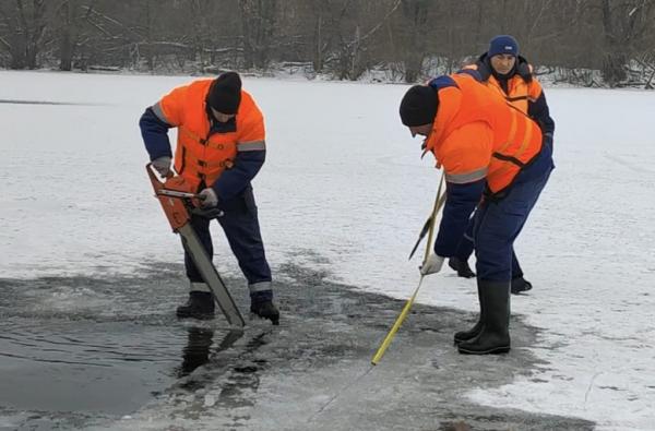 Прорубь размером 2,5 на 4 метра вырезали во льду реки Воронеж бензопилой. Майна расположилась примерно том же месте, что и в прошлом году.