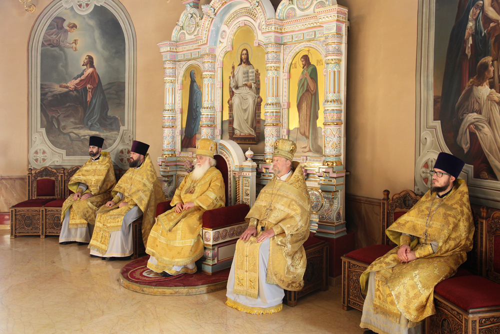 Его Высокопреосвященству сослужили протоиереи: Василий Бильчук, настоятель собора, Владимир Максимчук, ключарь собора; иереи: Сергий Гришанов, Виктор Архипкин; диаконы Андрей Кантарюк и Олег Мальцев, клирики собора.
