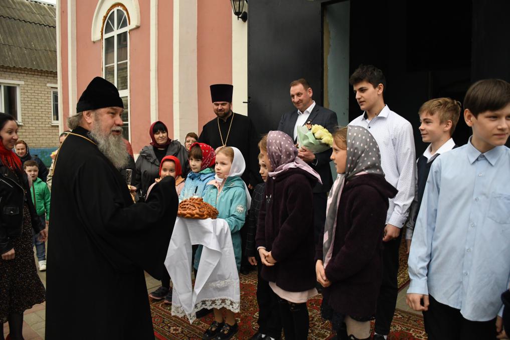 Владыку у входа в храм встречали глава администрации Данковского муниципального района Валерий Иванович Фалеев, дети воскресной школы, представители казачества и прихожане.