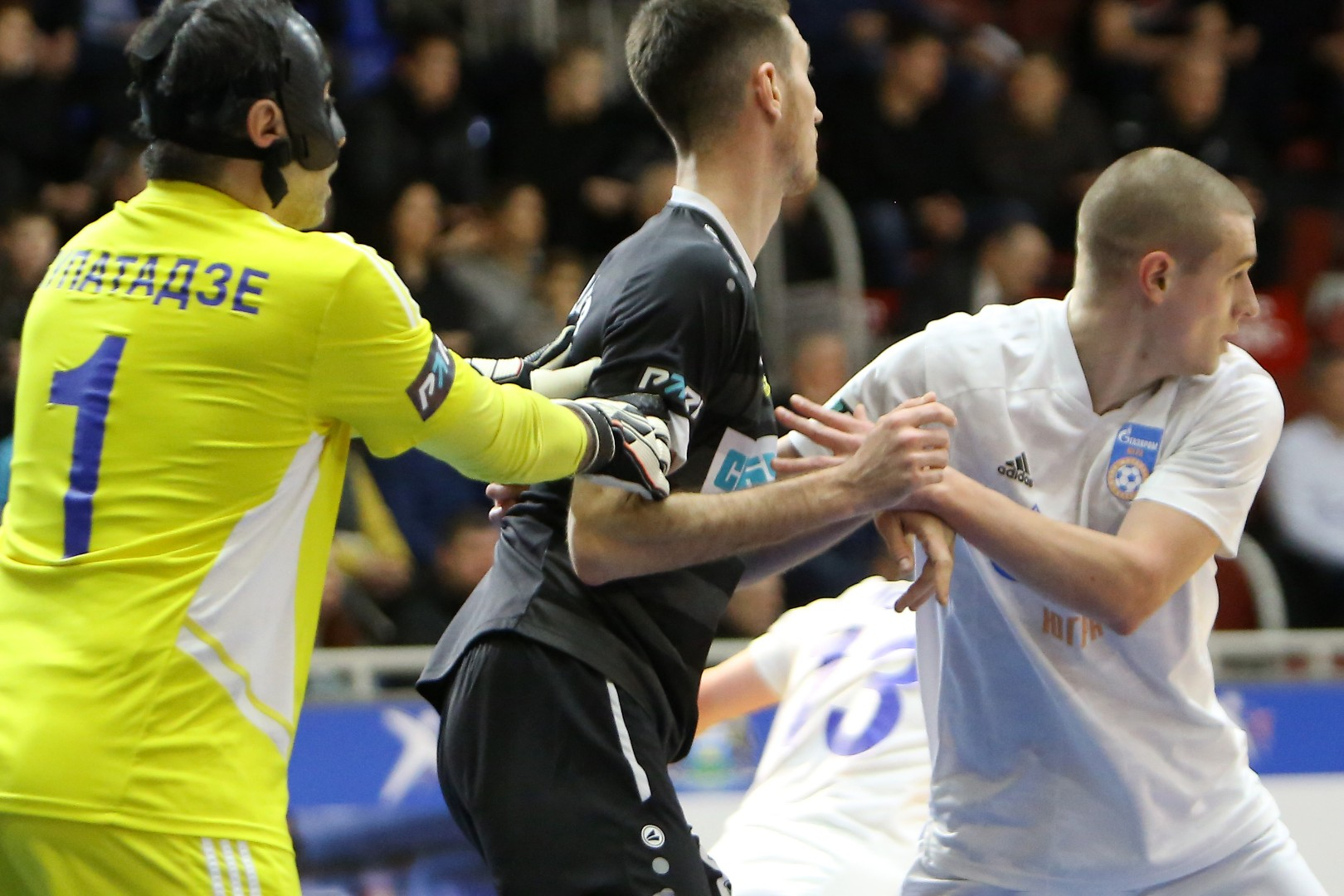 В тюменском дерби хозяева паркета и «Газпром-Югра» одержали по одной победе с минимальным счётом. В концовке первого матча при 1:1 «Тюмень» выпустил пятого полевого игрока, но пропустила в пустые ворота - 1:2. Автором решающего гола стал 43-летний голкипер «Югры» Звиад Купатадзе , из-за перелома лицевой кости играющий в защитной маске.
