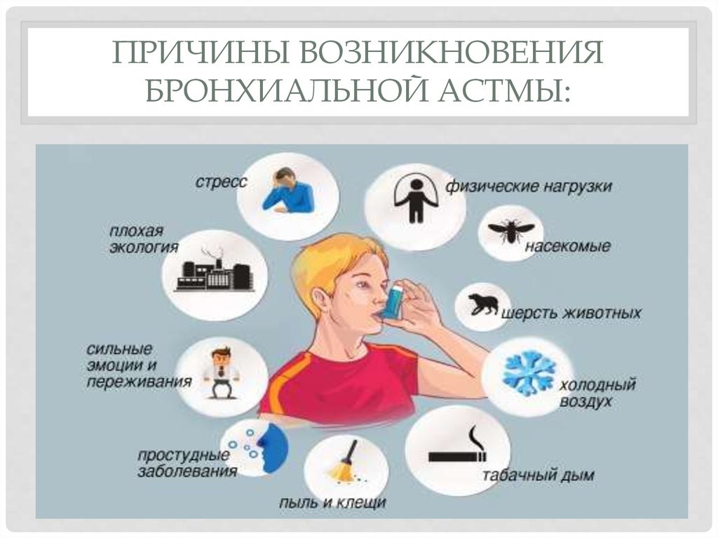 домашняя пыль; цветочная пыльца; шерсть животных; табачный дым; бытовая химия, косметика и средства по уходу за собой; заболевания дыхательной системы; профессиональная деятельность (подвержены астме работники химических производств, мастера по работе со строительными материалами, парикмахеры и другие работники салонов красоты, офисные и складские работники); некоторые лекарственные препараты; частые стрессы, длительное переутомление; неправильное питание; неблагоприятная экологическая обстановка.Чаще всего развитию приступов способствует непосредственный контакт больного с аллергеном. Обострения часто случаются в теплое время года, особенно в ветреную погоду.