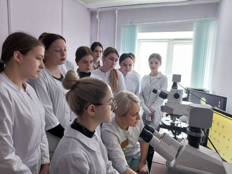 Увлекательную экскурсию провела врач-генетик высшей категории Инна Ивановна. Щербина Студентам показали работу отделения медико-генетического консультирования, цитогенетическую лабораторию, а также лабораторию массового неонатального скрининга. Сотрудники консультации продемонстрировали, как готовят образцы для анализа, проводят исследование и интерпретируют результаты. Участникам экскурсии представилась возможность наблюдать кариотипы редких хромосомных патологий: дисомию У-хромосомы, Робертсоновскую транслокацию, полиплоидию и другие.