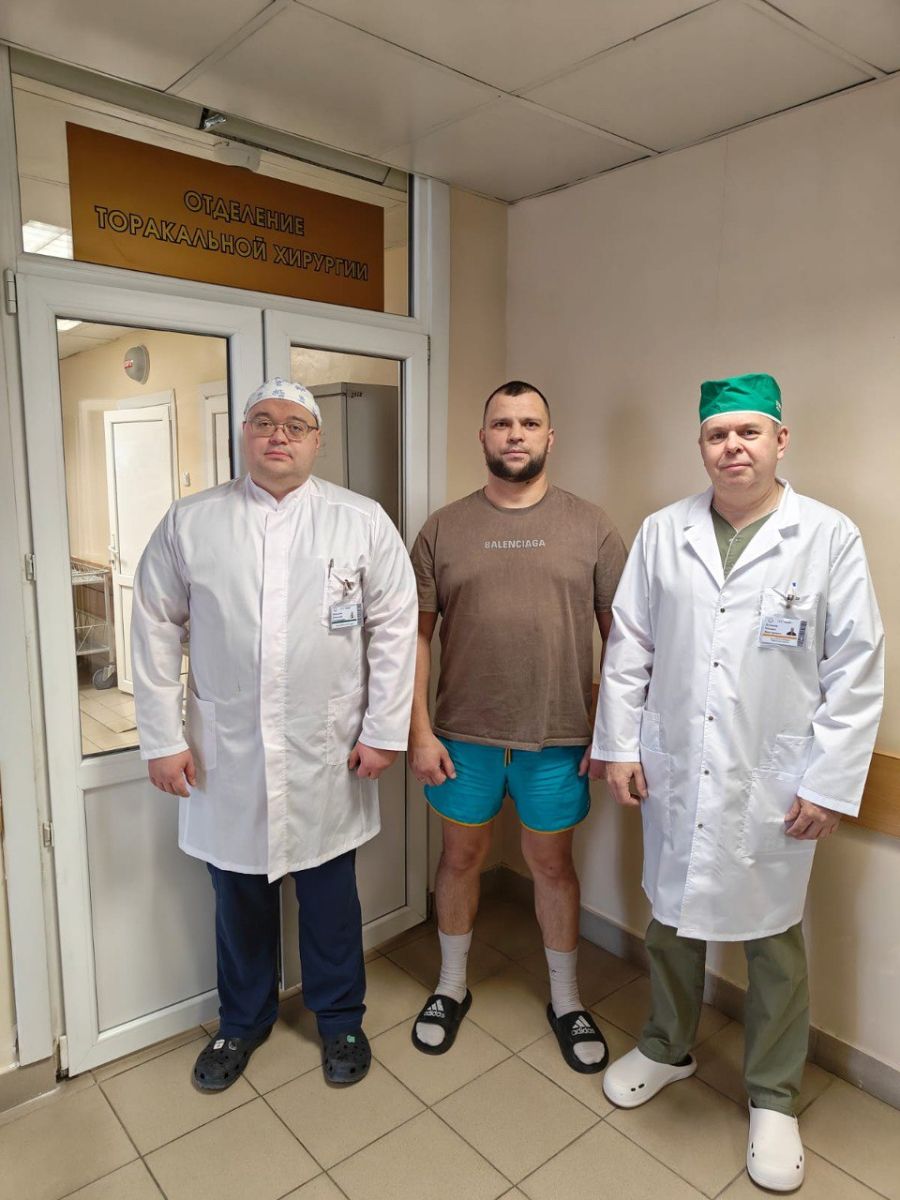 Сегодня пациента выписали. На фото с ним запечатлены торакальные хирурги, проводившие операцию, — Дмитрий Копылов и Михаил Демаков.