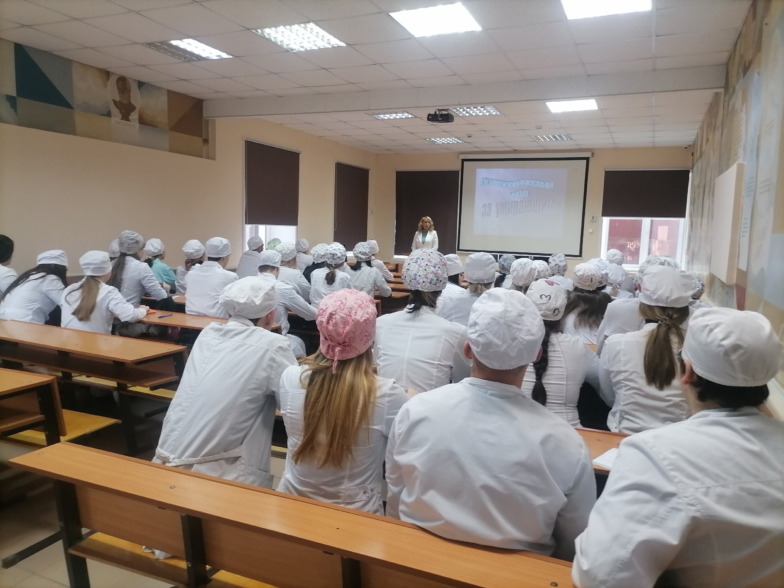 Педагог-психолог ГАПОУ “ЕМК им. К.С.Константиновой” Е. С. Меренкова рассказала студентам о принципах психологического ухода за неизлечимым больным.