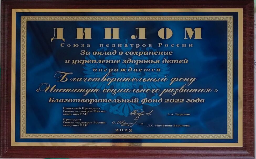 «Благотворительному фонду «Институт Социального Развития» Владимира Лисина присуждена награда Союза педиатров РФ «Благотворительный Фонд 2022 ГОДА» за вклад в сохранение и укрепление здоровья детей.