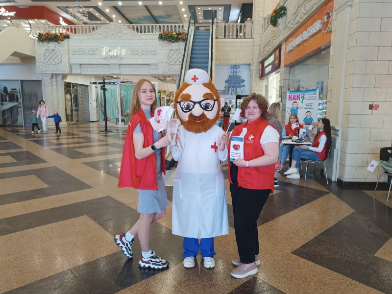 Волонтеры Липецкого медицинского колледжа с ростовой куклой Доктор призывали посетителей торгово-развлекательного центра вести здоровый образ жизни.