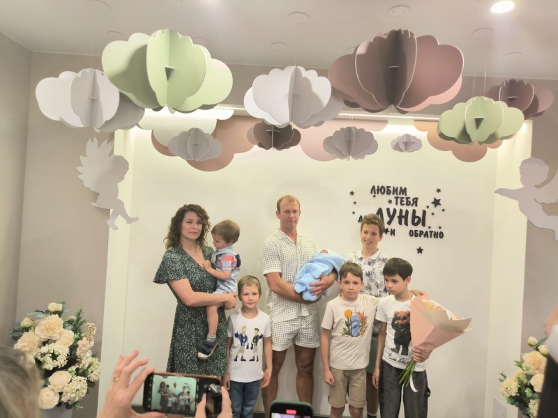 Первой, кто во время выписки смог воспользоваться новой комнатой, стала многодетная мама. В семье Юлии и Николая это уже пятый ребенок. Малыш родился с весом 4 кг 580 граммов. Всех деток Юля рожала в перинатальном центре, успела побывать и в старом корпусе роддома, и в новом. Всего в этот день выписались 12 новорожденных.