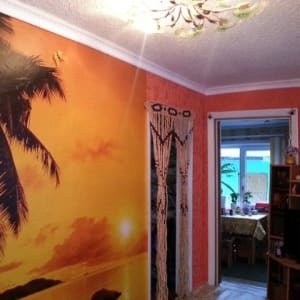 Одна половина из красного кирпича, 2 комнаты -большая гостиная, спальня, прихожая, кухня, ванна, туалет- совмещены.